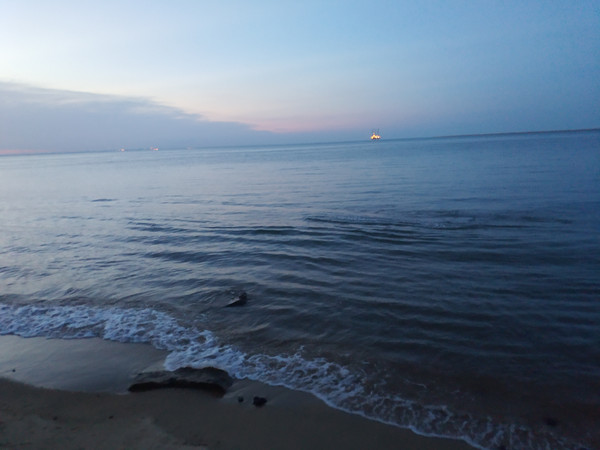 海面上的钻井平台上的灯光显得格外明亮,椰树顶上的叶子随风摇曳。