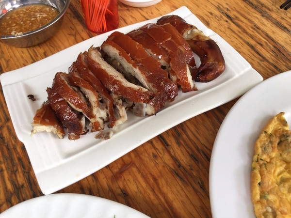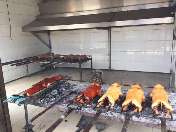 门口的烤炉上有好几只正在烤着乳猪,皮色金黄油亮,香气扑鼻,早餐吃得较晚,因此中午点的菜除了乳猪外其它的都剩下大半,打包带回酒店吧。