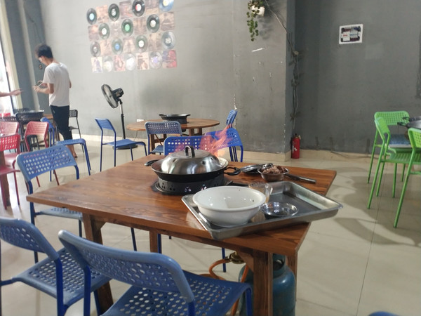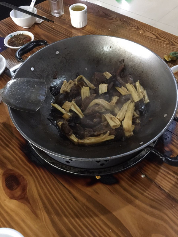 看着火焰在锅盖上腾起,别有一番风味,味道不错但可惜开始时有些嚼不烂,快吃完时才稍好点。