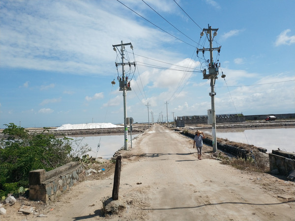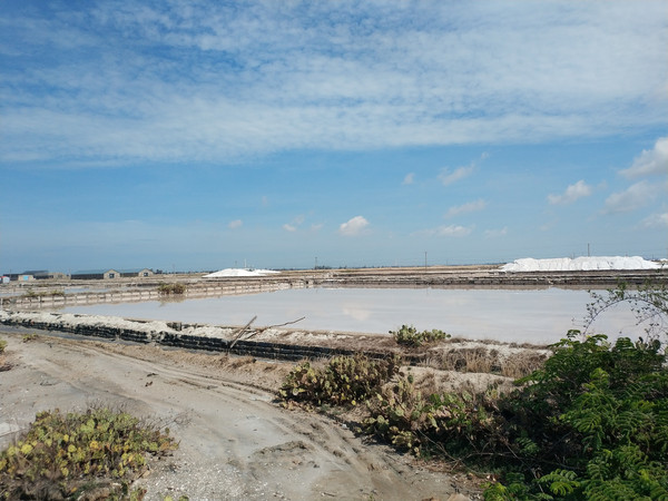 莺歌海盐场和古盐田不同,是现在正在生产的盐场,规模看上去蛮大,盐田中间堆放着不少大盐堆,盐田中间原先的车间好像是废弃了,屋顶都拆掉了,有铁路线直接通到盐场运生产好的盐,周围比较杂乱。