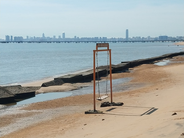 来到海滩边,已经涨潮了,海水已经快漫到沙滩上秋千的坐板了。
