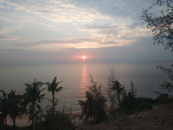 岸边山坡上的椰树叶在海风中摇曳,目送着落日在海平面上离去。。。