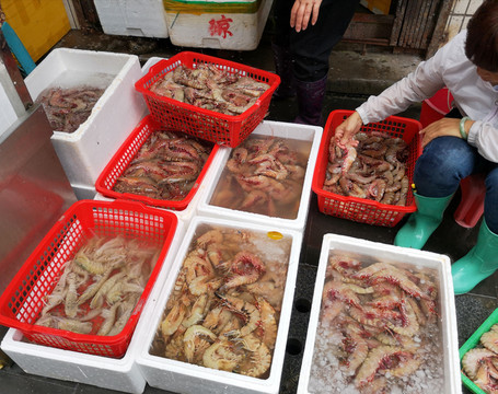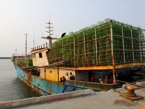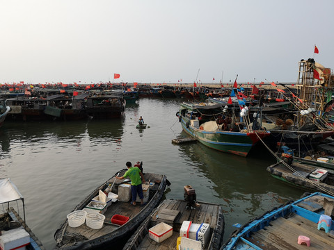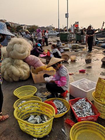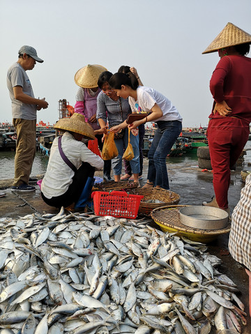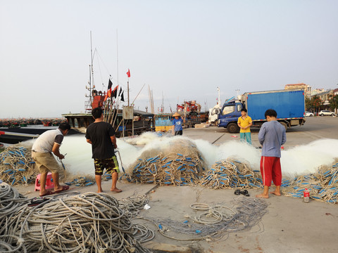 不管以后渔港建成什么样子,在我看来现在的八所渔港还是比较古朴自然的,防波堤内停靠了密密麻麻不少渔船,都是真正个人小型渔业营生,不是旅游产业的摆设。码头上一堆堆的海产和人群,买卖双方讨价还价声音不绝于耳,中间还夹杂着织网的渔人,一派渔港景象。听人说,八所港内的本地渔船数量不多,因八所地理位置居于海南西部中心,南北渔船都喜欢在此停靠,比如这里就停靠着许多儋州的渔船,这里逐渐成为一个重要的海产品集散地。