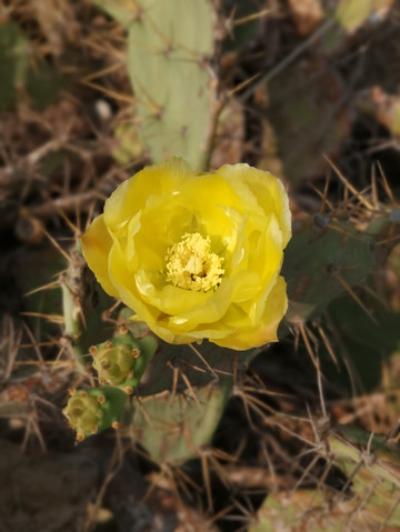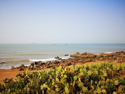 整个鱼鳞洲山体周围随处可见岩石峭壁上覆盖着耐旱的各种灌木、杂草和仙人掌,这些植物深深扎根于岩缝间。将近中午,走下山坡,成片仙人掌黄色的花朵悄然开放,成为镜头中蓝色大海的前景。