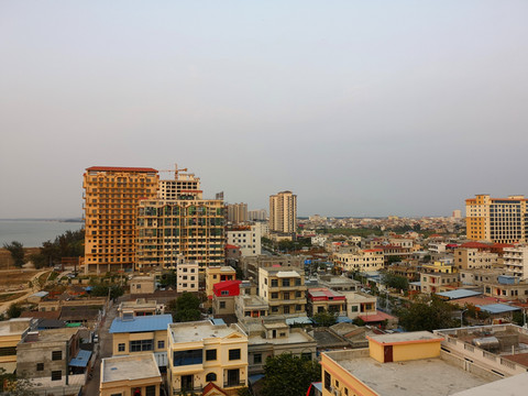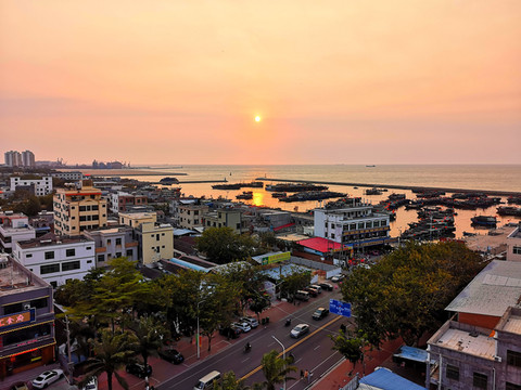 所住东方良智大酒店在东港路与海岸街交叉处,顶层有餐厅和酒吧,白天可以远眺八所渔港全景和八所市内街景,以及北面一座座新的楼盘和小区。傍晚和入夜,渔港内“渔火”点点,保持着大海的生机。