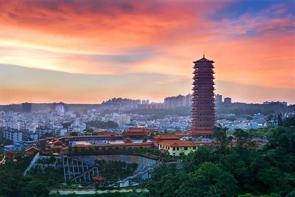 澄迈金山寺,依山而建,登顶可俯视全城。寺庙建筑气势雄伟,金碧辉煌,回廊曲折,气象万千。