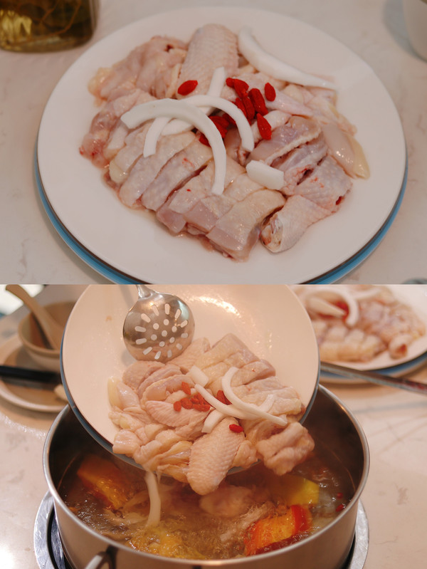 必点菜品,三个海南椰青椰子肉以及简单的枸杞、木瓜花胶等配料一起煮开后,加入文昌鸡,3-4分钟就可以吃啦。开吃前一定要先喝完椰子鸡汤,椰子香浓郁,甜而不腻。文昌鸡肥瘦相间,吃起来肥而不腻,还融入了椰子的清香和甜味。一定要沾店里特色的蘸料。