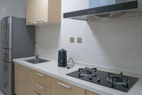 让人惊喜的是,房东还为我们贴心准备了消毒液和一次性口罩,感动满满。房间还设有厨房,冰箱、燃气灶、电饭煲等可供使用,可以满足基础的做饭需求,当然,如果和我一样懒得做饭的话,出门步行2分钟即可到达商业街,各种饭店应有尽有。