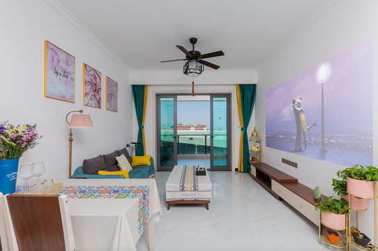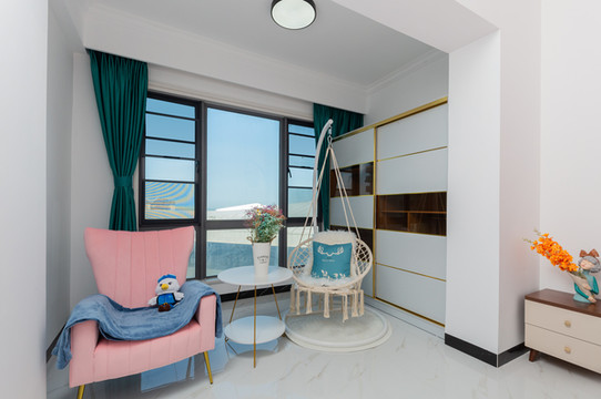 值得一提的是,阳台配备网红休闲吊椅,舒服的色彩组合,增添了几分柔美,这里同样是极佳的观景台,打开窗帘,便是碧海蓝天,十分适合小憩和闲聊。