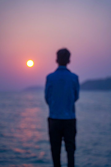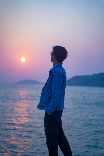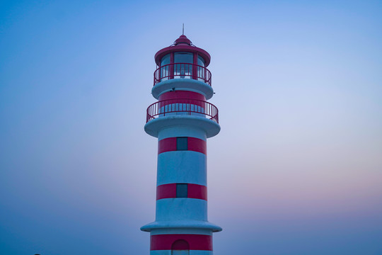 远眺海面,一轮霓虹的落日挂在海面上空,天空红霞弥漫,粉色橘色淡紫色相互晕染,有种让人欲言又止的美丽,浪漫不请自来。此刻的我站在灯塔下方,胶片定格的瞬间,仿佛在与灯塔进行一场神秘的对话,红白相间的灯塔静默不语,宛若一位德高望重的长者,端庄而优雅。