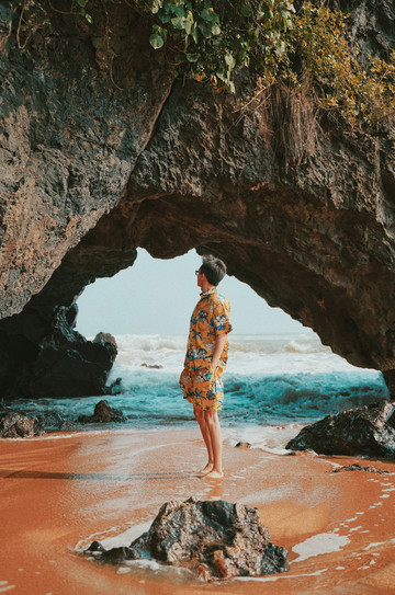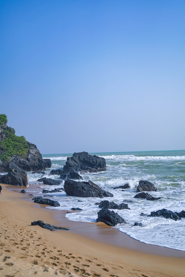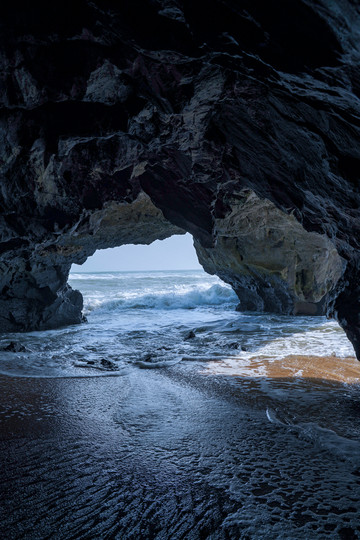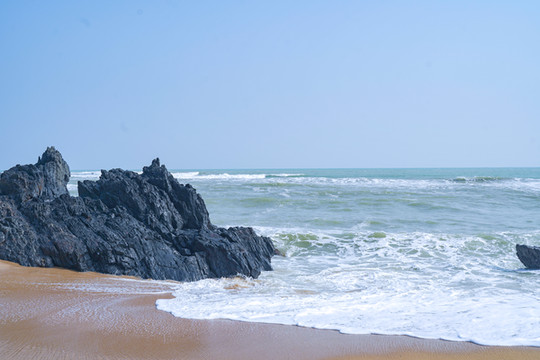 除了燕子洞独具一格,这里的礁石群、海浪等同样极具个性,沙滩上怪石嶙峋,黑色礁石密布,有种不可言喻的深邃,宛若一颗颗镶嵌在沙滩上黑玛瑙,锋芒毕露。这里一步一景,礁石上,海岸边,洞穴处,都是一处处得天独厚的拍照胜地,快门闪烁的瞬间,定格下一幕幕幽静画面,满屏的日系感呼之欲出。