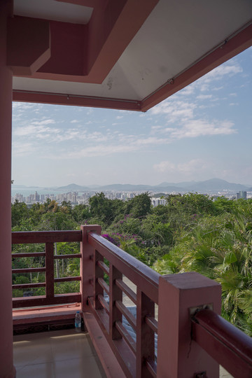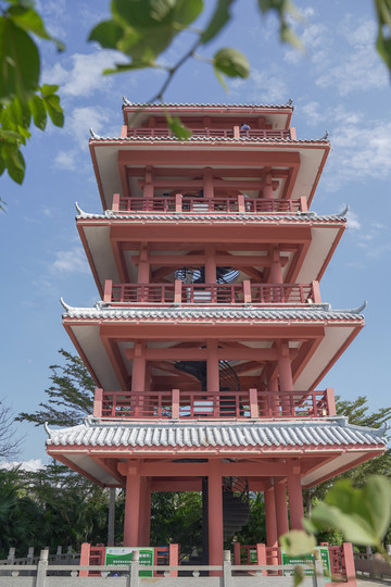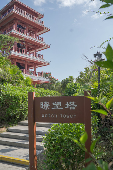 继而往前,“瞭望塔”映入眼帘,一座高四层的观景塔遗世而独立,红白相间,两侧绿植交相辉映,充满诗情画意。这里是一处得天独厚的观景平台,视野辽阔,可将三亚美景一览无遗,有种“一览众山小”的意境。栏杆处红漆脱落,略显斑驳,清风迎面,无限感慨油然而生。