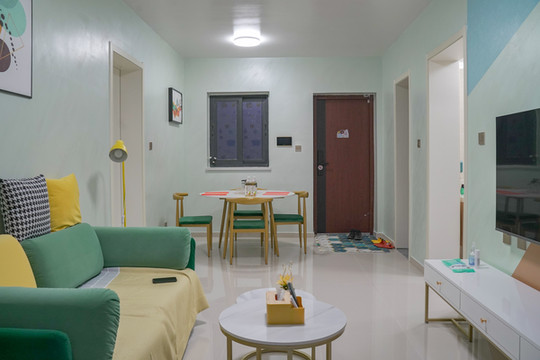 民宿的装修温暖居家,极具生活气息,细节处的陈列透露出生活情调,是理想中的温馨小窝,初见便倍感宾至如归。客厅的设计清新简约,莫兰迪色系相互碰撞的柔软沙发,法式复古的餐桌,精致典雅的吊扇,搭配偌大的投影仪,营造出舒适惬意的私密空间。