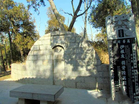 最后来到处于柏树林包围中的一代名相伊尹的墓地,墓地前是一座琉璃瓦顶四柱木质的彩绘门廊,门廊后就是伊尹墓。墓高3米,周长46米。周围有石彻墙,高2米,墓四周有高大古柏183棵,密茂参天,西南角有鸟柏1株,枝叶呈现鸟形。坟前墓碑为清同治年间所立,长方形,圆顶方座,碑高2.05米,宽0.48米,厚0.18。篆字题名:“商元圣墓”(即伊尹墓碑)。1981年,“伊尹墓”作为词条收入了《中国名胜词典》。