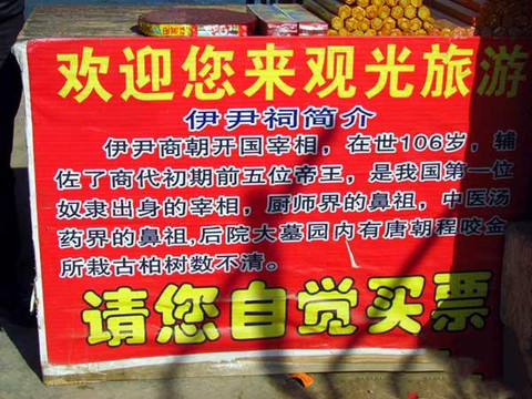 走进伊尹祠,映入人们眼帘的是一面影壁,上面是对伊尹的简介,即伊尹祠碑记。伊尹是我国历史上第一位奴隶出身的宰相,他年轻是有莘氏的一位做饭的奴仆,后被提升为疱人(厨师)和有莘氏女儿的老师,后商汤听说伊尹有才,便要用重金聘请他,有莘氏留住不放,于是商汤便向有莘氏求婚,有莘氏的女儿嫁给商汤时,伊尹作为陪嫁才来到商汤身边,并辅助汤建立商,自此我国史册上才有了伊尹的名字。