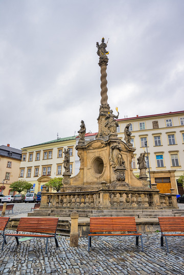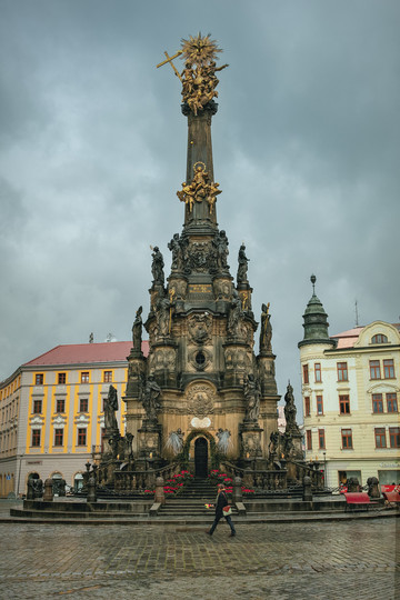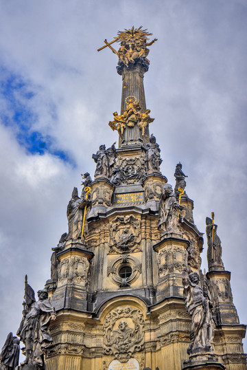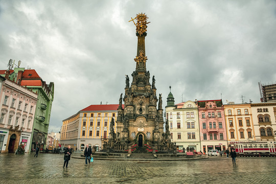 广场上巍然耸立的就是奥洛莫乌茨人的骄傲,捷克最大的巴洛克雕塑群像, “圣三位一体纪念柱”,兴建于1716–1754年,高35米。具有重要的历史和艺术价值。