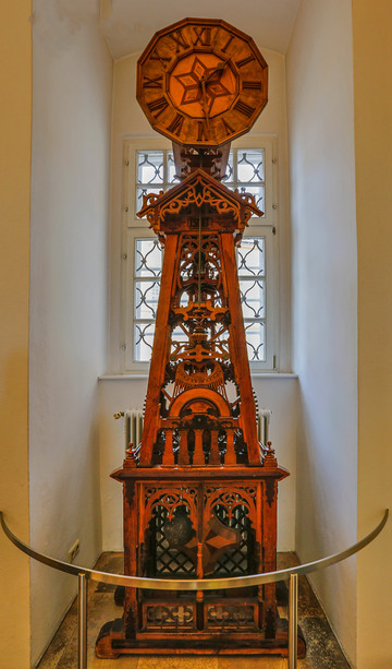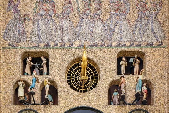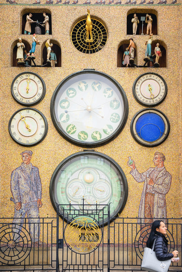 我们现在看到的是捷克处于社会主义时期修复的,象征社会主义理念,钟表面马赛克拼贴画也是当时流行的社会主义现实风格,原来整点报时出来的是圣经里的12位圣人,现在则是象征无产阶级和工人阶级的各行业劳动者们出来和歌起舞,生动地表演,非常卡哇伊。
