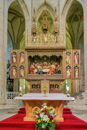 教堂里有圣坛和8个放射状的小礼拜堂、唱经楼,与众不同的是,这座是以银矿为主题的教堂,保存了珍贵的中世纪壁画原作,以描述挖采银矿、铸造银币、打制银器为主题,记录了这座小城的光辉岁月。