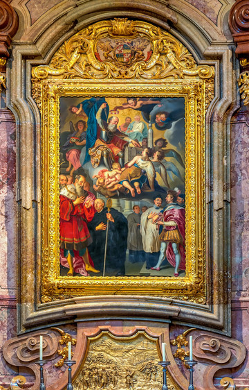 这也是一个巴洛克式的纪念柱,顶端是圣母像,底座是八位圣人。