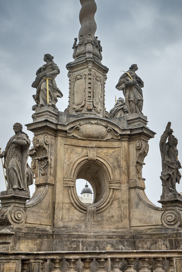 “圣三位一体纪念柱”的设计是三层结构,顶层金色的三位一体圣像,中间十米高的石柱上,悬挂着圣母升天群雕,金色童贞圣母玛利亚被两位展翅的天使托举,衔接着神界与人间。装饰繁复,每层都环绕着六位圣人的立像石雕,基座下面,是有七层台阶的底座。