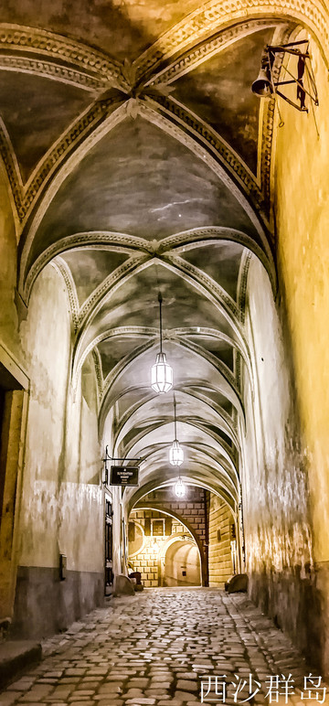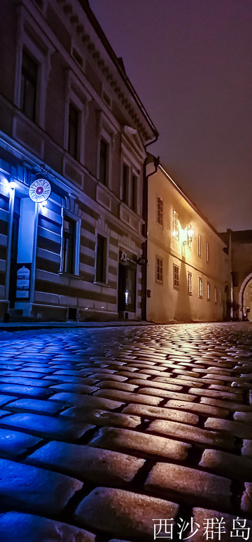 夜幕下小镇笼罩薄薄的雾气,拉格朗特街青石方块路面折射昏暗的灯火,两边的商铺大多已打烊,行人寥寥,古城几许神秘。