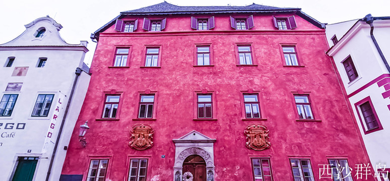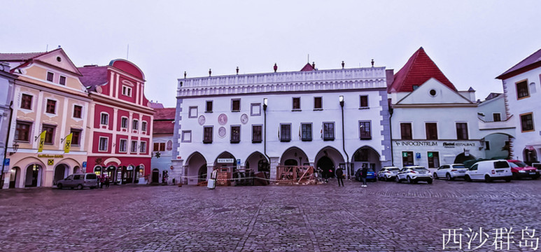 集市广场北侧的市政厅是一幢简洁大气的白色3层建筑,墙上饰有捷克国徽、CK城徽以及曾统治此地的家族徽章。