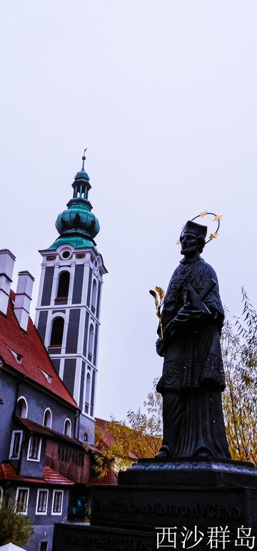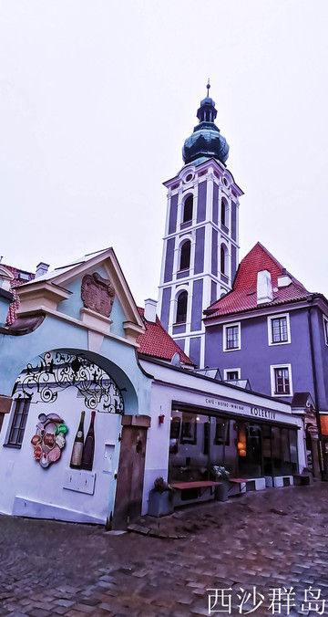 克鲁姆洛夫小城有三座高塔,其中最粗最高的是彩绘塔,位于克鲁姆洛夫城堡内;彩绘塔下方的有着绿色尖穹顶的是jost大教堂;而位于伏尔塔瓦河对岸的细细尖尖的就是圣维特教堂。