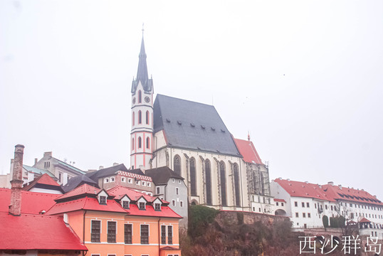 早在14世纪初罗森伯格家族(Rožmberky)的彼得一世曾在此兴建一座小教堂。这个家族于1302-1602年统治克鲁姆洛夫长达三百年。1340年教堂在德国建筑师Linhart的指导下重建,而现在看到的则是1407-1438年重建的晚期哥特式教堂。19世纪末的改建将之前建造的大部分巴洛克元素一一去掉,塔尖也由巴洛克式的圆形改为现在的新哥特式尖顶,显得巍峨壮观。