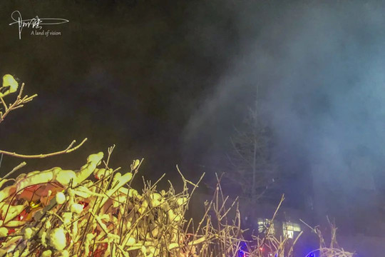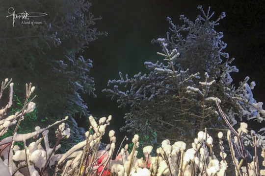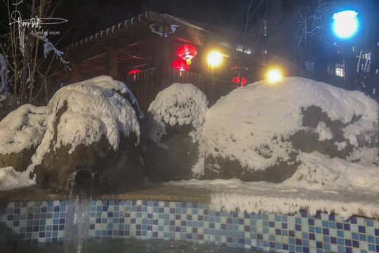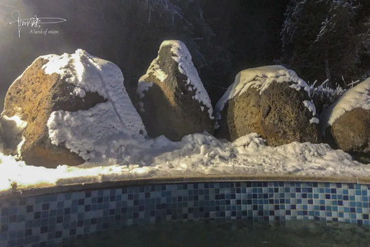 夜色中,没有细数有几个汤池,但我们按着顺序体验了四五个,最低的39度,最高的45度(好像是这样,现在已经不敢太确定了)。只用手机拍了几张环境照,每个露天的水池边都围着一圈覆满积雪的大小树木和石块,既保护了客人的隐私,也格外凸显“冰火两重天”的意境。
