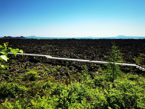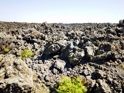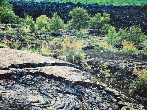 铺天盖地的火山溶岩,有的如惊涛巨浪,波涛汹涌;有的似涓涓细流,随风荡漾;有的像条条钢绳,卷曲扭动;有的似株株树干,整齐排列,宛若一幅雄奇天然的黑色雕塑画廊。