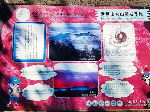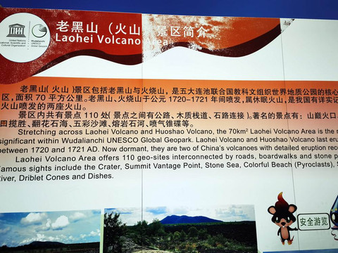 游览老黑山景区,可观赏到中国最年轻的两座火山——老黑山与火烧山,远观火烧山,攀登老黑山,目睹火山口的壮观。图为景区简介。