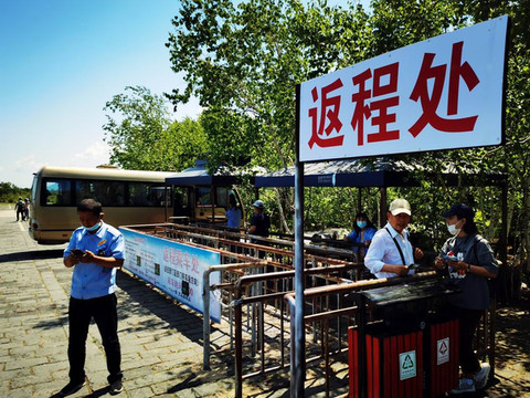 老黑山景区禁止一切外来车辆在本区内部行驶,而一律采用内部交通(环保车)。图为景区的环保车站。