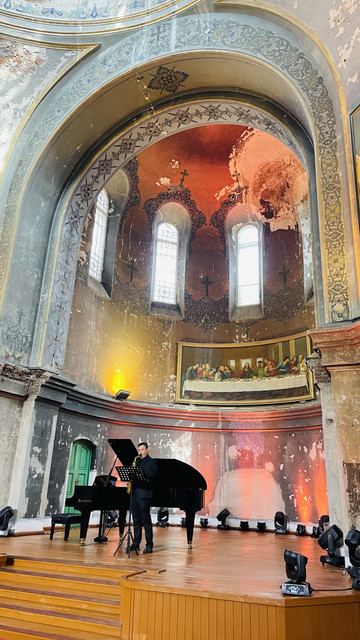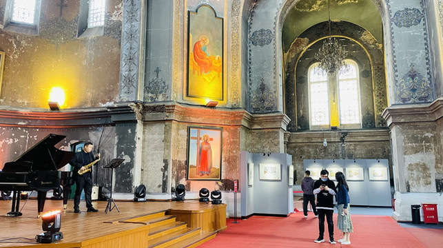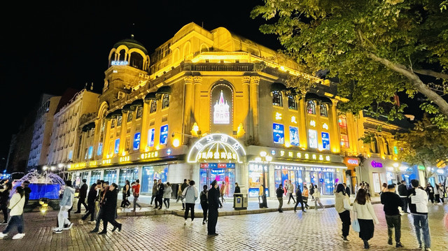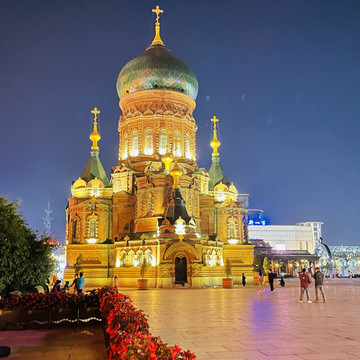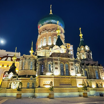 索菲亚街角咖啡的位置拍摄最佳,其他角度拍会拍到背后的现代建筑,去时正好有音乐画展,门票20元/人,一张门票可以去街角咖啡换一根马迭尔雪糕,这个雪糕的口味好像大白兔奶糖,奶味还可以。教堂晚上会开灯