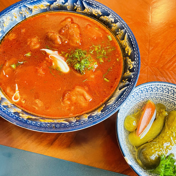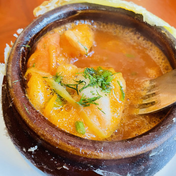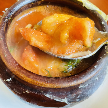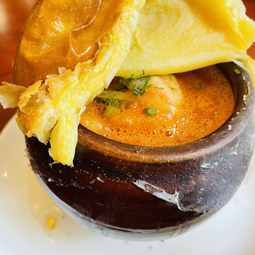 罐闷牛,罐闷虾,看上去罐子不大,牛肉和虾好多,入味,带汤,罐子上是一层起酥🍞,奶油焗杂拌上层是奶油土豆泥,下层是培根粒火腿粒,乌克兰红菜汤有点像罗宋汤,但比罗宋汤味道浓郁一点,俄罗斯熏肉汤,俄罗斯菜有点中西结合,上海好像没看到过俄罗斯菜,第一次尝试,不错子