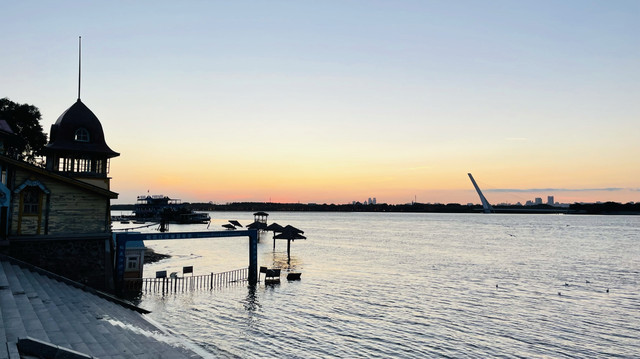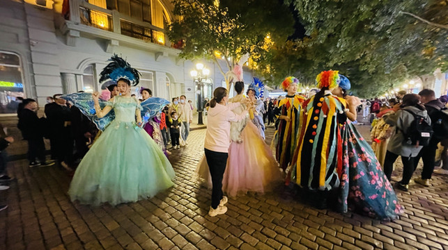 传说中的过江摆渡17:00就没了,我们只好坐二号线到人民广场再走到松花江畔,也就是斯大林公园的东头,沿江边一直走20分钟就是防洪纪念塔,也就是中央大街的一头。周末晚上的松花江畔格外热闹,唱歌摊子就好几个,左耳七里香,右耳莫斯科郊外的晚上,江边夜风蛮冷。中央大街上中俄贸易店比几年前来的时候少了很多。