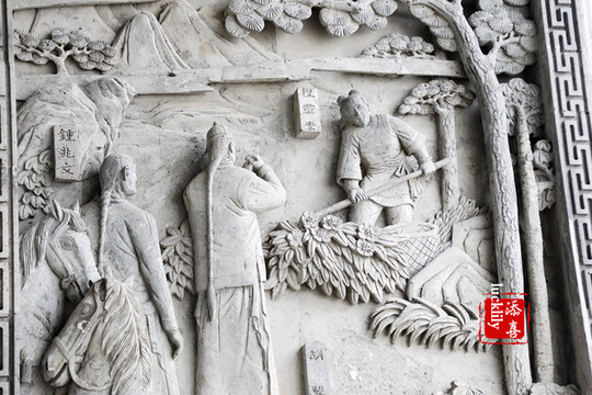 走进金庸书院,首见一条条长长的甬道,铺着一块块古朴的青石板,这是进入书院的主通道,甬道两旁摆放着昂扬的松拍类盆栽,最吸引人的是甬道一侧围墙上金庸先生的创作“射雕英雄传”、“笑傲江湖”等15部金庸作品的石刻画,雕刻精细传神,令人记忆翻飞,浮想联翩。