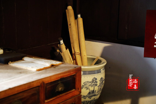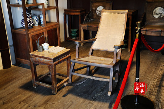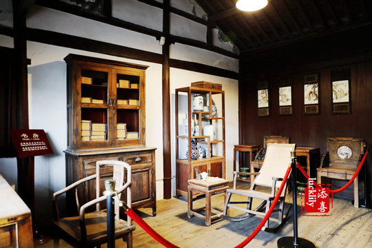 朝南三间正室分别为王国维父母卧房、王国维先生卧房、王国维先生书房。先生的书房布置十分的舒适,宽大案台临于轩窗,室中有摇椅,椅边放着书籍和烟壶。房内架上、桶里的书卷似乎还散发着淡淡的墨香味道。
