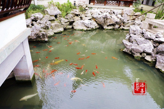 书剑堂后是一方亭台楼阁环绕的小院,此时春日将至,绿植都开始抽出了嫩芽,池中的金鱼安然悠闲的游嬉着……