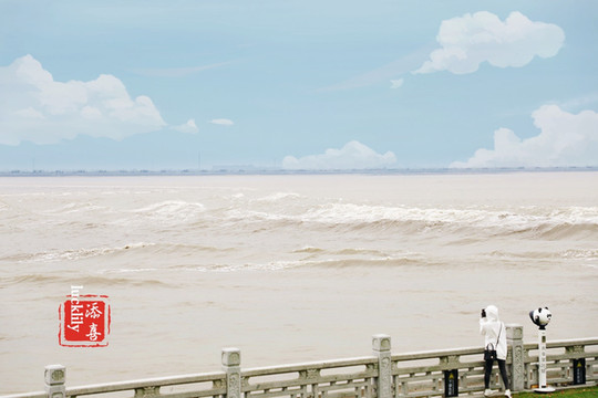 潮起时,远远看见天际有一条白线,慢慢的倾来,当临近时,便听大浪滚滚,气势如宏,奔流不息的向海而去……整个过程都非常的壮观。
