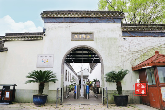 从海神庙到金庸书院也是非常的近,每次来盐官都会去金庸书院走走,虽然是女生,但是从小也是受父亲的熏陶看着金庸先生的武侠小说长大,长大后又沉浸在那些故事的儿女情长里。金庸书院的主入口面朝春熙路,坊门半月形,门上是“金庸书院”四个金字。