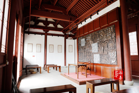 穿过桃李门,就来到了金庸书院的正门,为砖雕台门。跨过石质的门槛,走过小石桥,便是书院的中心--讲堂,名为书剑堂。古朴的大讲堂坐落于一池碧水之上,丝丝细雨轻轻落入池中,装点着这一座带着浓浓文化气息的建筑。