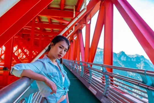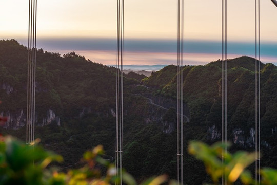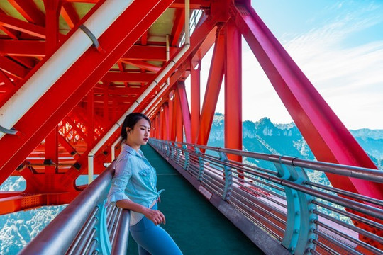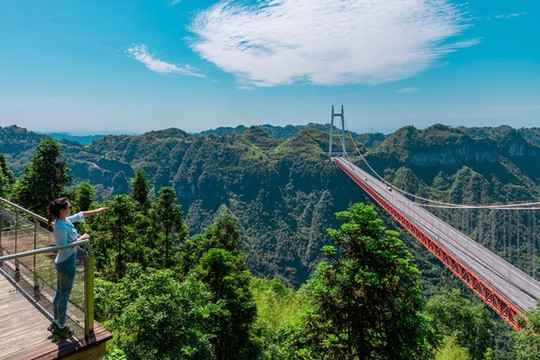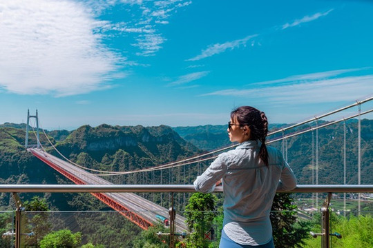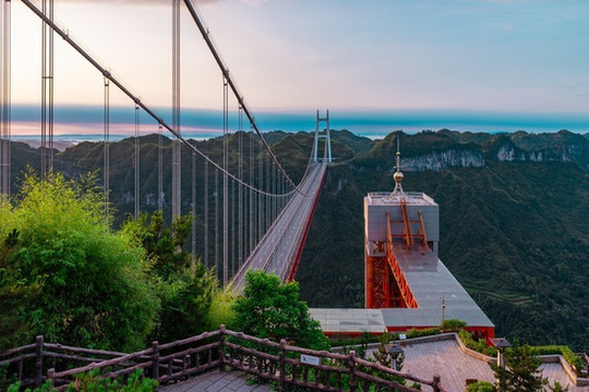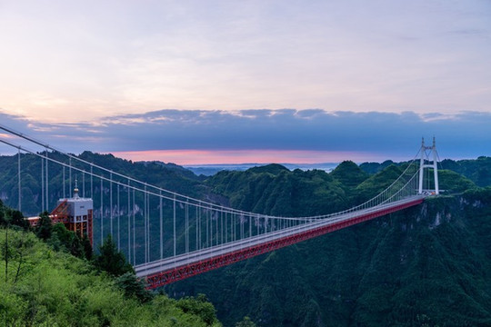 左边大桥,右边是去大桥第二层观光 通道 的观光电梯,电梯采用贴山钢结构井架的方式修建,应用曲面玻璃透光,视野宽广,完整的将大桥、峡谷、村寨收入眼底,是一种不错的观光体验。