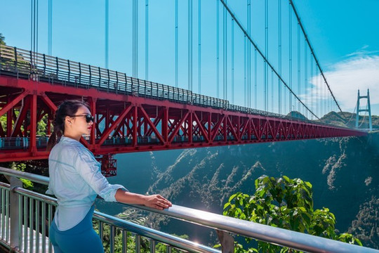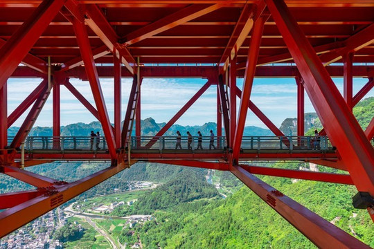 桥梁的钢铁部分都被刷成了大红色,走在观光 通道 里面整个红彤彤的,太红红火火让我有些恍恍惚惚,赶紧看看脚下的翠绿森林和掩藏其中的盘山路,还有那谷底的村落河流。