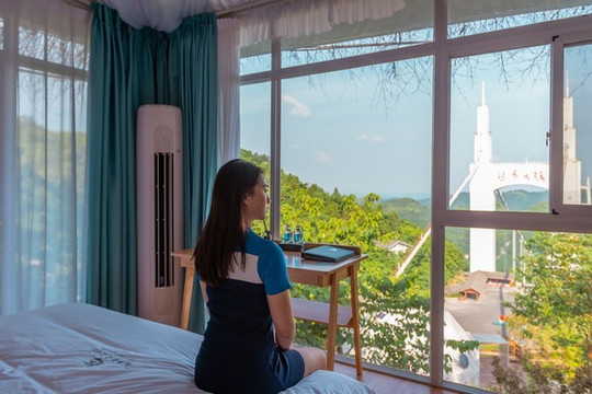 凯哥住的全景玻璃屋,超赞,躺在床上就可以看大桥,简直绝了。就是太阳晒着有些热,不过有空调问题不大,电动窗帘也是非常方便,按一下按钮自动开关,特别省心。