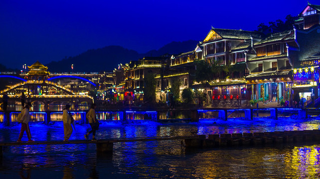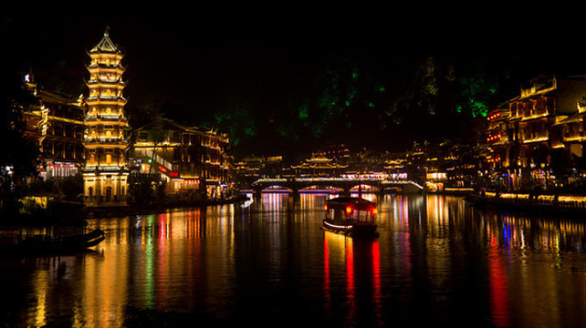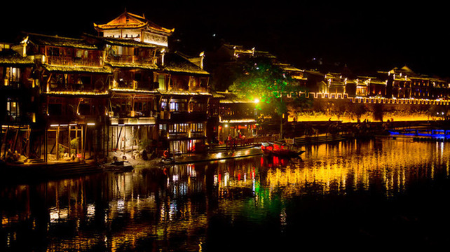 凤凰的夜景很漂亮,两岸的灯光倒映在水面,浮光掠影,一片璀璨,格外让人心动。