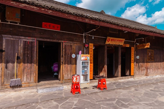 小镇不大,多是几十年前的老建筑改造而成。老旧的标语而今已久存在,恍惚间仿佛穿梭了时空,来到了那个工业重镇,朱砂开采的时代。