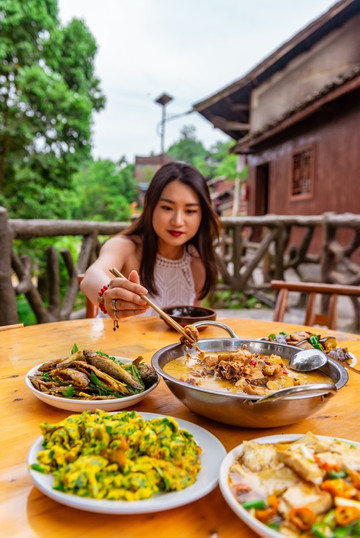 宴席上面很多菜肴都是就地取材, 比如 小虾米、桃花虫、小螃蟹,这些就在寨子旁边的小溪流里可以捉到。
