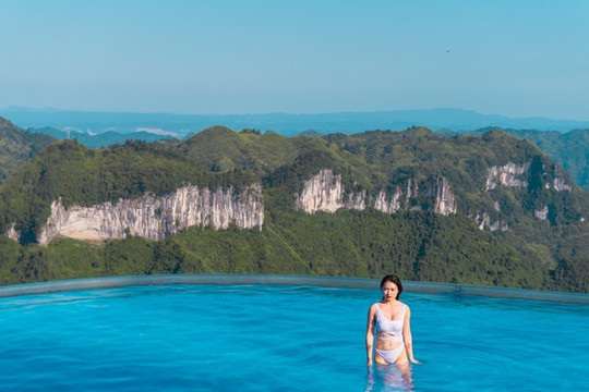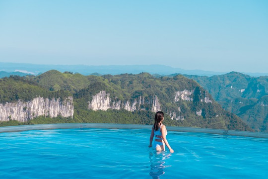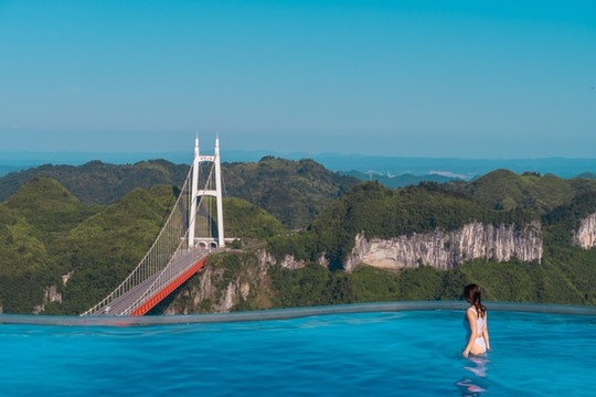 在 仙居 最高处是一个颇大的无边际恒温泳池,同行妹纸换了泳衣欢快的游了几圈,然后听风看矮寨大桥,惬意得舍不得离开。