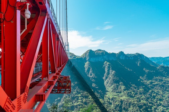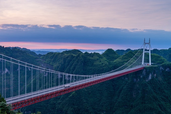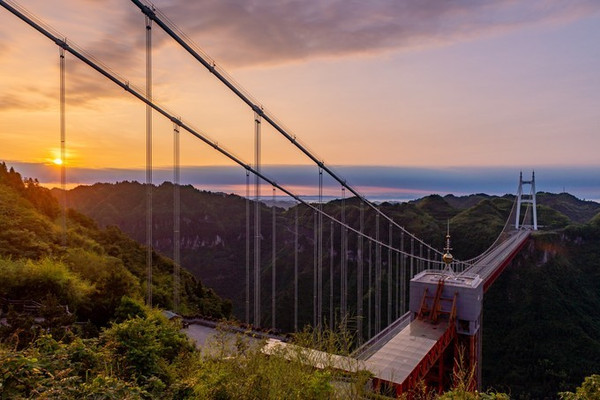 此桥地处云贵高原和沅麻盆地交界处,地势险要,桥梁建设中当时创下了四个“世界第一”:主跨峡谷悬索桥长度世界第一;世上首次采用塔、梁完全分离的结构设计方案;采用轨索滑移法,架设钢桁梁施工,世 界首 创;采用岩锚吊索结构和碳纤维为预应力筋材,世 界首 创。大写的赞!