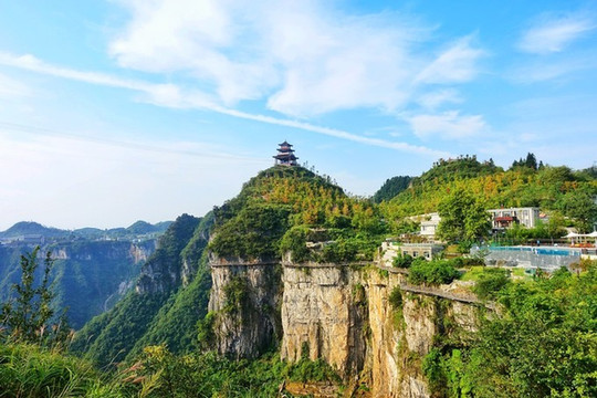 问 天台 位于吉斗苗寨旁峡谷深处,为绝壁高崖之间一突兀 高台 ,三面为深不见底的山涧,这样的孤岛石台 国际地质界称之为“金钉子”剖面,是世界级地质奇观。